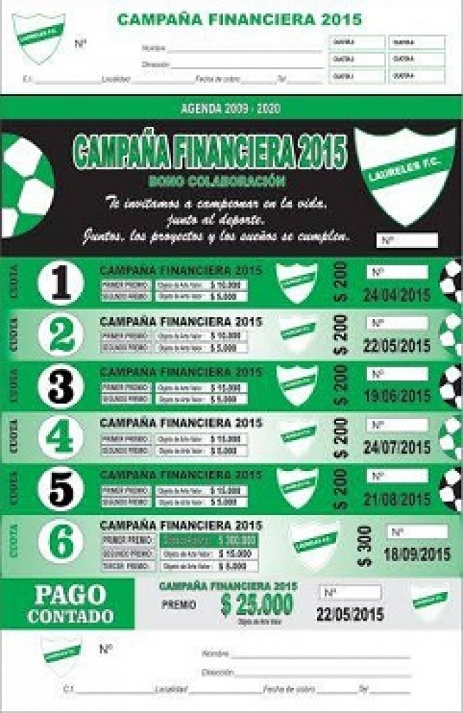 NOTICIAS . Como es habitual año a año el Laureles F.C. pone en circulación los bonos de su campaña financiera los que han sido de gran suceso y aceptación esto le permite a Laureles cumplir con los objetivos edilicios, sociales y deportivos planificados. |