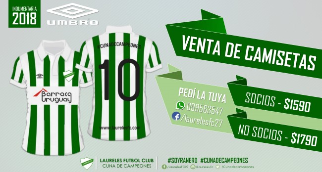 * Pedidos hasta el 02/04/2018. * Número y nombre a elección. * Precios: SOCIOS - $1.590 NO SOCIOS - $1.790 Forma de pago: $1.000 pago de seña para confirmar y resto antes de la entrega de la camiseta. * Talles de niños y adultos S, M, L, XL. PEDI LA TUYA: Whatsapp, mensaje o llamada al 099563547 o por nuestro facebook oficial https://www.facebook.com/LaurelesFC27 |