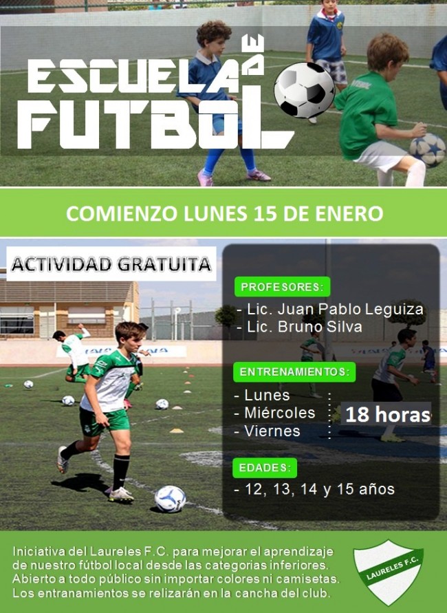 Actividad gratuita, abierta a todos los niños y adolescentes de 12 a 15 años. Por segundo año consecutivo Laureles lleva adelante esta escuelita de verano, junto a los profesionales Juan Pablo Leguiza y Bruno Silva. Lunes, miércoles y viernes, en el Parque Abbate, están todos invitados para aprender jugando, y mejorar las condiciones individuales, compartiendo en grupo. Una oportunidad también para ir dando los primeros pasos en la cancha grande. Todos invitados a aprender, pateando la pelota. Laureles te invita a CAMPEONAR EN LA VIDA, JUNTO AL DEPORTE. |