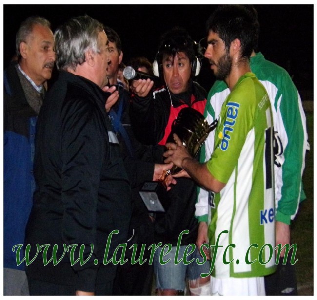 En el día de ayer, 18 de setiembre, la Liga Departamental de Fútbol de Río Negro junto a familiares de Enrique Bertoni nos hizo entrega del tan merecido trofeo que el Laureles F.C. ganara con total justicia con una fecha de anticipación a la culminación de dicho torneo. Luego de la entrega se disputo el encuentro que restaba para completar el calendario, oportunidad que el cuerpo técnico aprovecho para dar minutos a jugadores juveniles y que habían alternado en partidos anteriores pero con pocos minutos mas aquellos que salían de la recuperación de lesiones, el resultado del partido indico que caímos 3 tantos a 2, quizás lo mas justo hubiera sido un empate pero en el fútbol los goles se hacen no se merecen y de esta forma finalizamos nuestra participacion en dicho torneo con la meta superada pues no solo se logro la clasificacion al torneo de honor sino que se logro el campeonato clasificatorio 2014.... vaya nuestras felicitaciones al cuerpo técnico, jugadores..... y a nuestra parcialidad pedirle que continue alentando al equipo como hasta el momento en el torneo que se avecina... SALUD CAMPEÓN ....ARRIBA LAURELES!!!